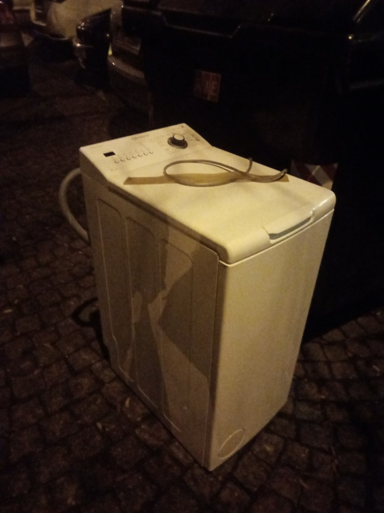 Stará pračka v ulici Pospíšilová u kontajneru hospody.