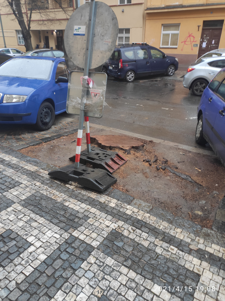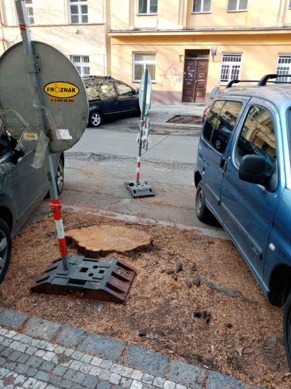 V ulici Žerotínova bylo káceno v únoru 2021 několik stromů. U posledního z nich zůstaly zákazové značky na 24.2., přesunuty parkujícími do nejméně překážejících pozic. U daného stromu však pracovníci neprovedli úpravu pařezu seříznutím, tak jako u ostatních, zůstává zde tak v průchodu mezi parkujícími auty jednak překážka v podobě ponechaných značek a jednak zbytkem pařezu.