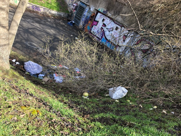 Rozsypane odpadky po velke plose parku a ver. komunikaci