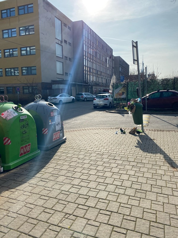 Dlouhodobě nevyvezený kontejner na sklo + přetékající koš na psí exkrementy