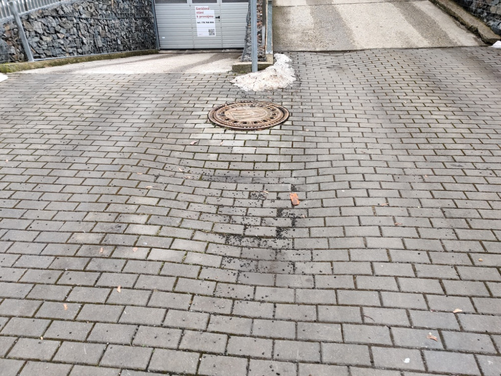 Propadlá zámková dlažba v chodníku u vjezdu do garáží. Prosím o předání kompetentní osobě. Děkuji