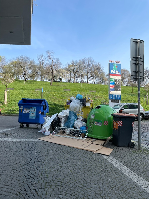 Odpad kolem žlutého kontejneru roh Kalisnicka Domažlicka