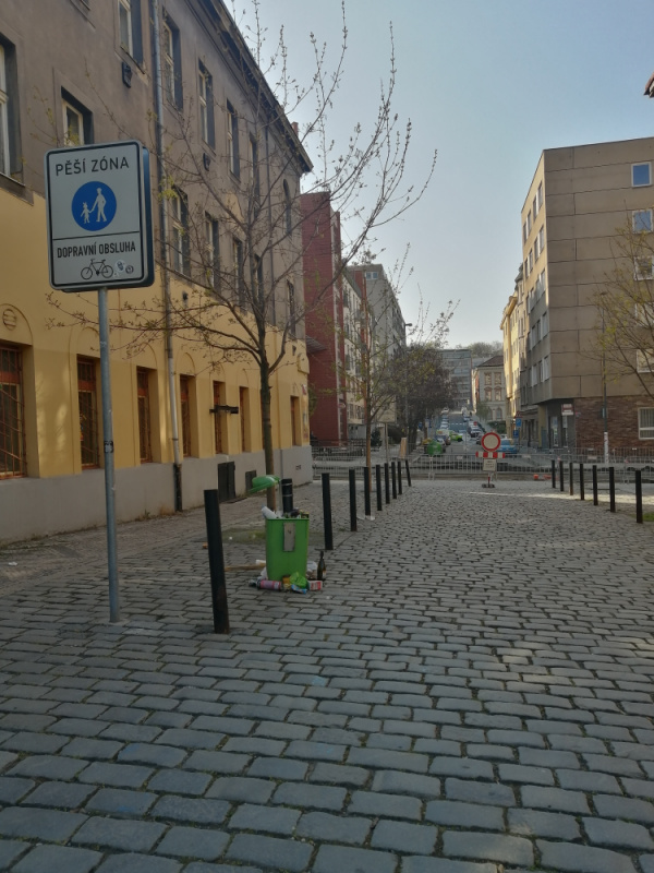 Rozbity odpadkovy kos, smeti vsude kolem.