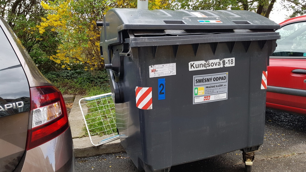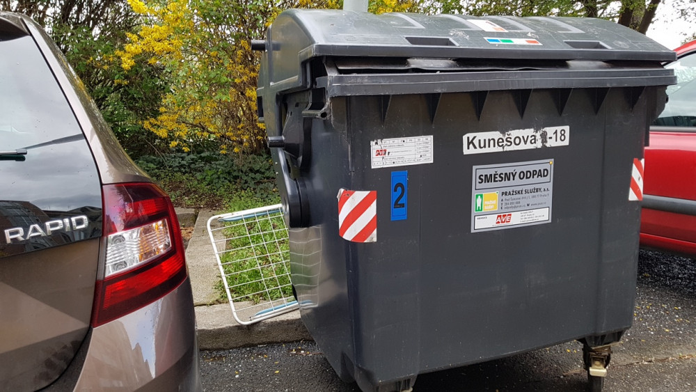 Ke kontejneru opět někdo vyhodil sušák na prádlo. Kunešova 10, Pha 3