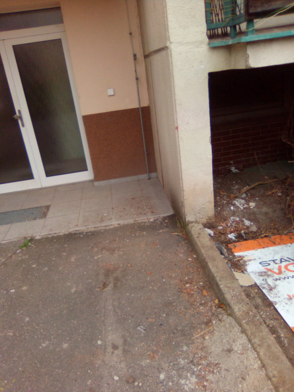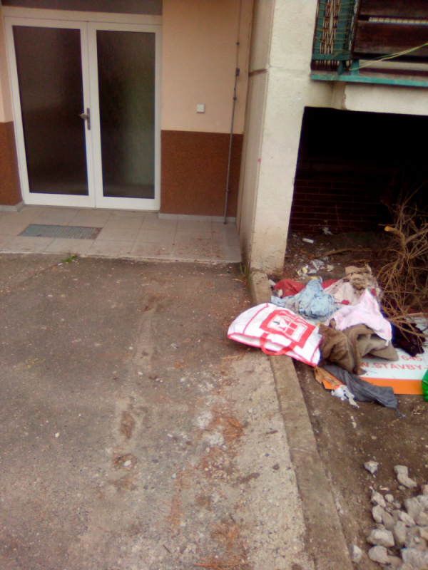 Za domem U kněžské louky 10, příjezd z ulice v Okruží, je na přístupové komunikaci v těsné blízkosti zadního vchodu poházené oblečení a další nepořádek, zřejmě od bezdomovců.