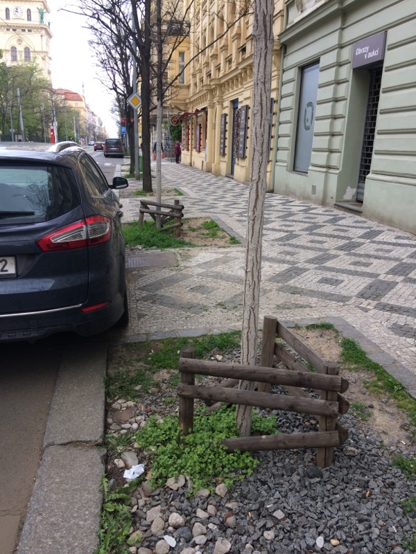 Korunní 77, polámaný ohradník kolem 2 stromů