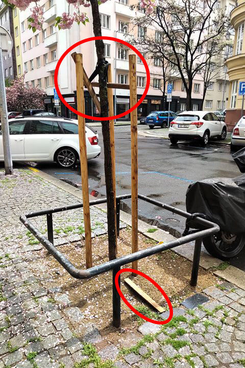V ulici přemyslovská - před čísly 31, 33, 35 jsou nově zasazené stromy, kterým se rozpadá podpora (viz fotka).