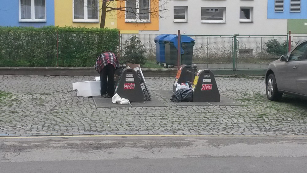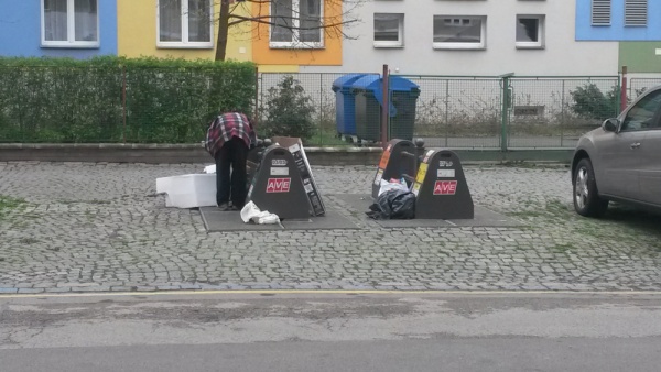 Neporadek kolem kontejneru na trideny odpad pred skolkou Jeseniova 98. Dekuji uklid.