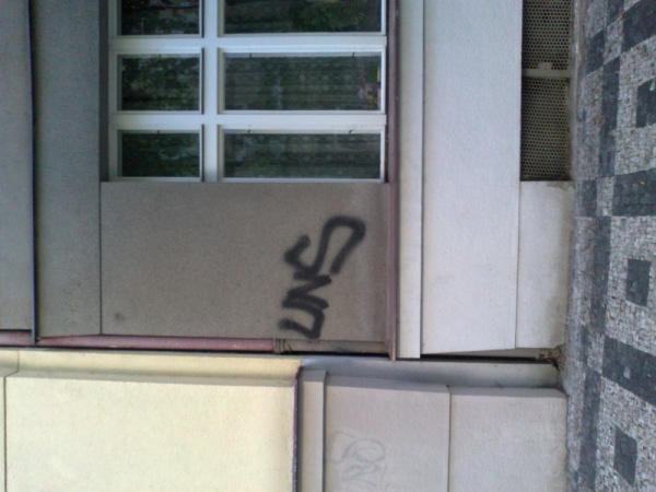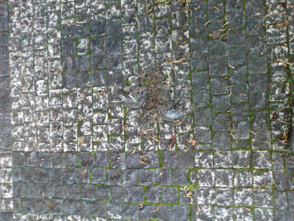 Na chodníku mrtvý holub - několik dní. Hranice domu Zvonařova 3 a Vietnamské prodejny.
