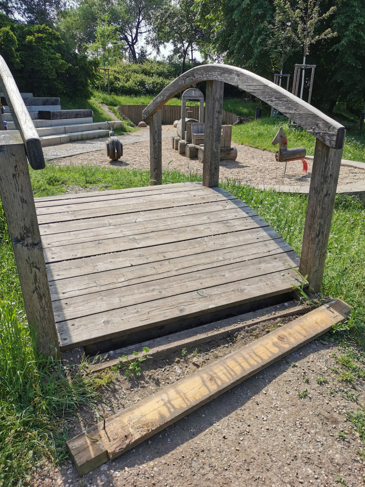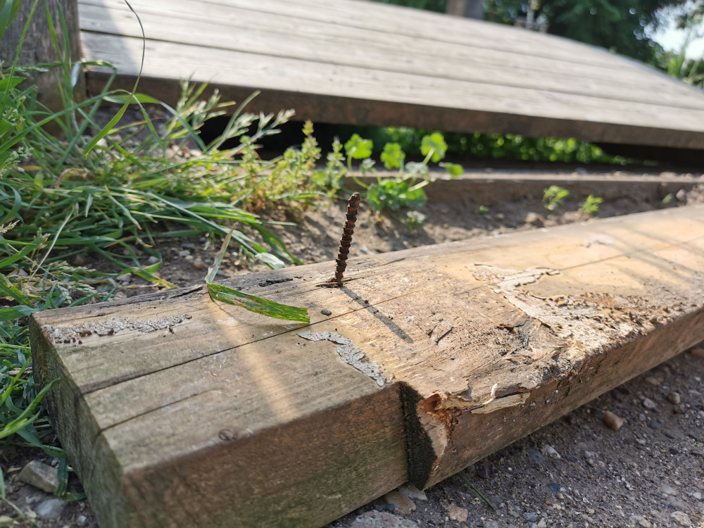 Poškozený most pro děti. Odpadlé spodní prkno, ze kterého ční rezavé šrouby - pro děti dost nebezpečné.