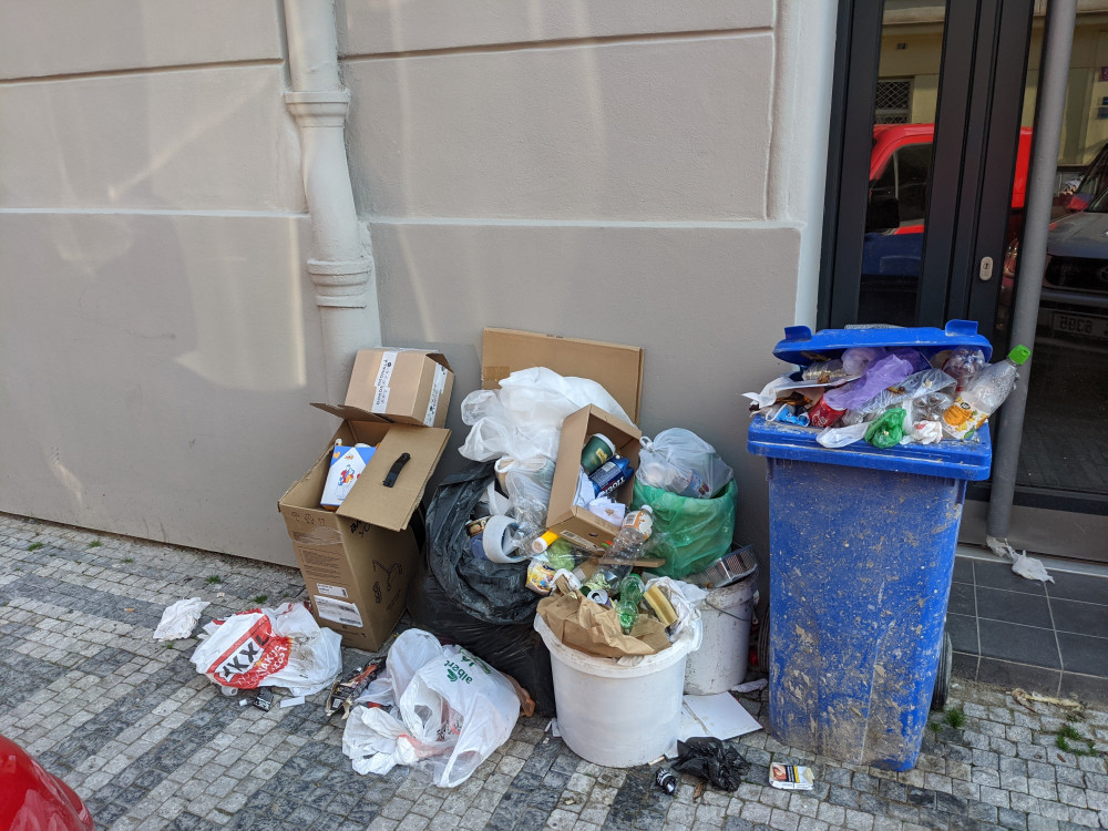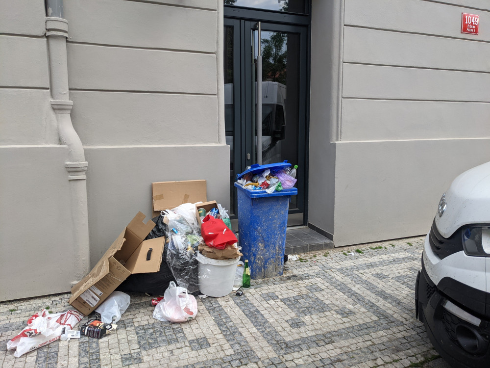 Dobrý den, sem tam měsíc-dva cestoval modrý kontejner od domu k silnici, teď je plnej odpadku, přiřazen ke zdí a obrůstá dalším odpadem. Je to nechutný pohled, za chvíli se nedá projít po chodníku. Podle PSN, která již dům nevlastní, informace byla předaná na společenství vlastníku, ale ani tak nic není uklizeno. Rozdíl ve fotkách je den.