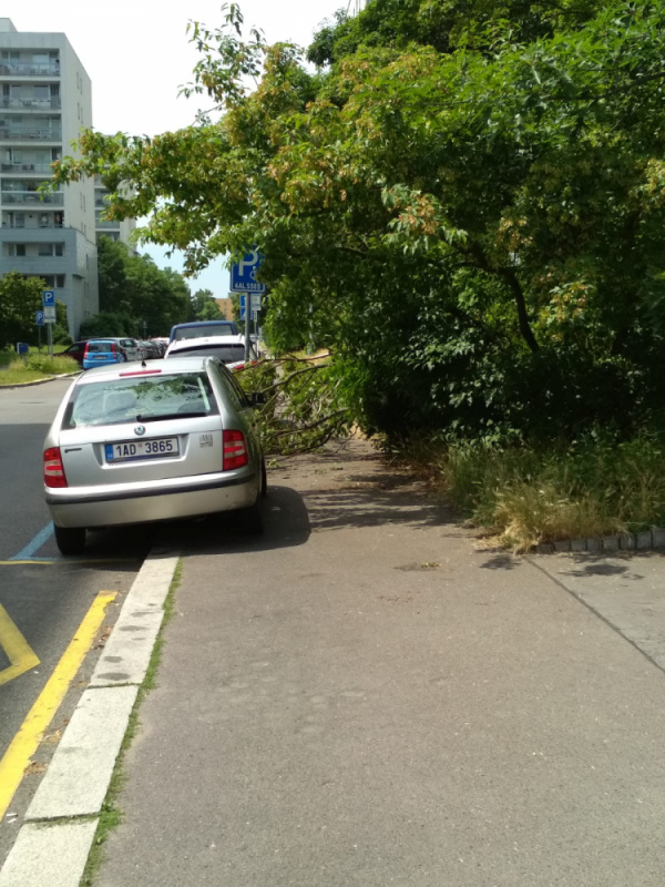 Naklánějící se větve omezují průchod. Habrová ulice, před kontejnery na tříděný odpad, proti domu č. p. 10.