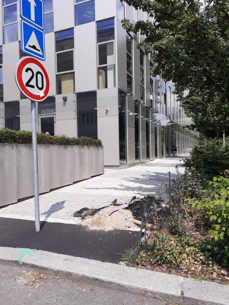 V ulici Kouřimská mezi budovou Č. spořitelny a Budovou Crystal zůstaly zbytky asfaltu a jiných materiálů po výkopových pracích.