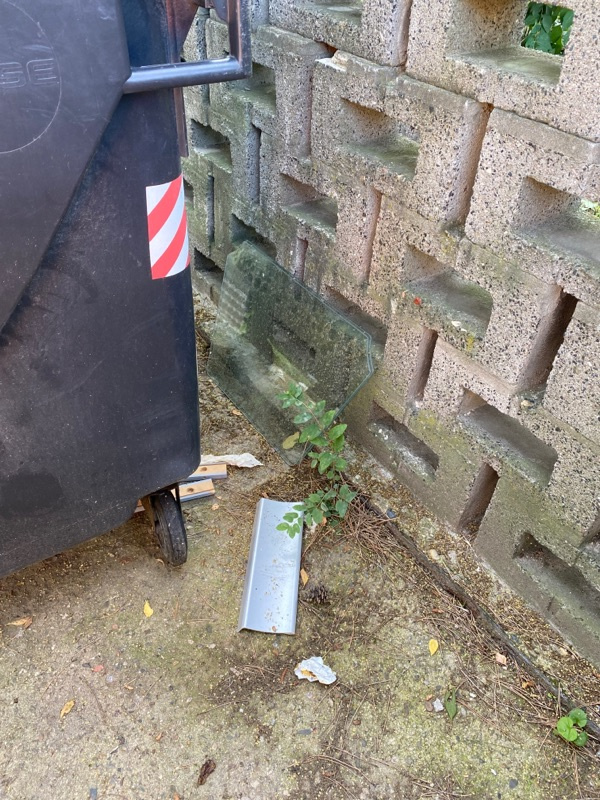 Vyházené odpadky z kontejneru. Za kontejnerem dvě tabulky skla.