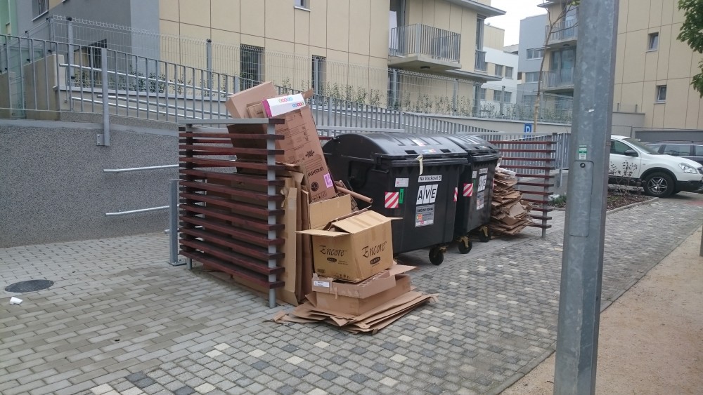 Díky za zprávu a úklid, jen se bojím, že se to bude v dalších týdnech opakovat, protože to, co dnes pánové z AVE uklízeli, vypadalo po dvou dnech od úterního vyvezení némlich stejně jako moje fotka z neděle 16. října. Možná by šlo vylepit na dveře nových domů, že mají za rohem sběrný dvůr (a firmy - dodavatelé kuchyňské a jiné techniky a vybavení bytů povinnost odvézt obalový materiál, ne ho pohodit u popelnic na směsný odpad), ale nevěřím, že by to pomohlo...