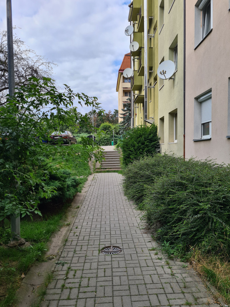 Keře zasahujíci do chodníku. Po chodníku se tak musí kličkovat a chodit za sebou.