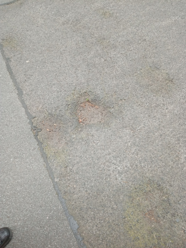 Díry ve vozovce v ulici Křížkovského u domu č. 18.