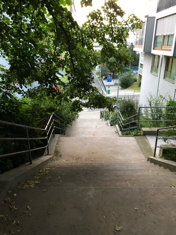 Přerostlá větev stromu na schodech z Parukářky, omezuje průchod.