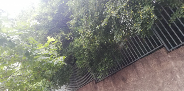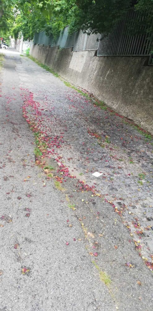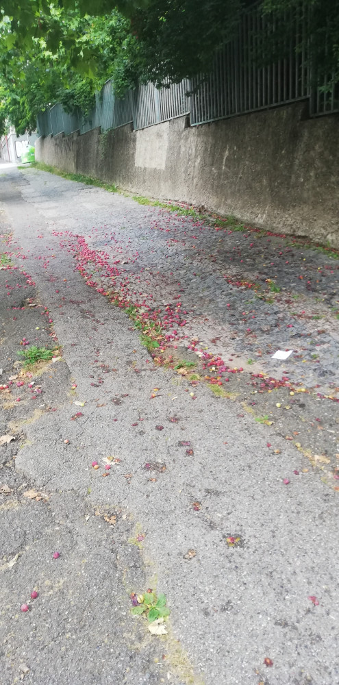 Popadané ovoce - asi špendlíky, na chodník, hrozí nebezpečí uklouznutí.