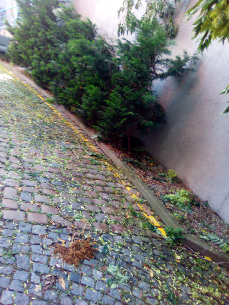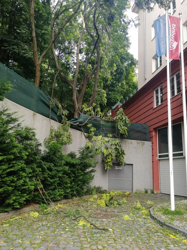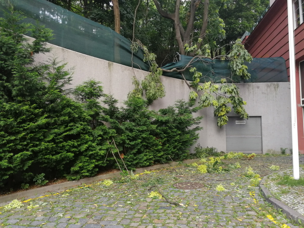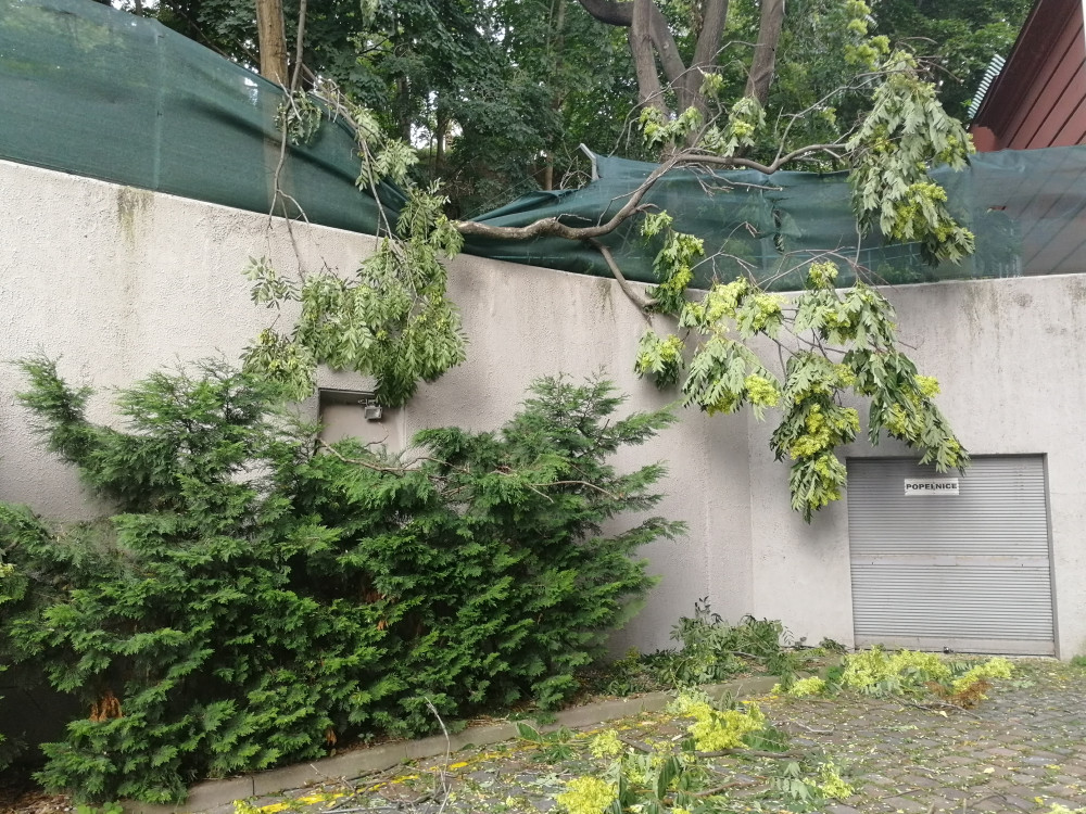 Pravděpodobně bouřka polámala stromy před budovou Českobratrská 2778, pod Parukářkou. Větve leží ve vjezdu do garáže.