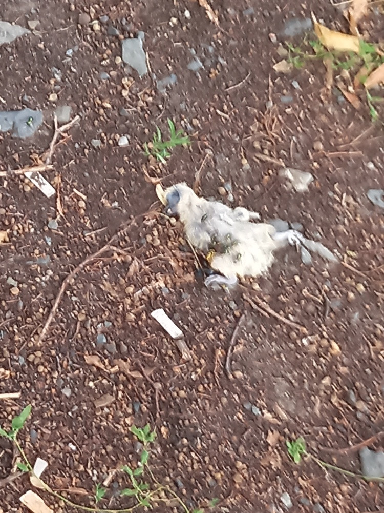 dva mrtvý ptaci pod stromem u kontejneru naproti bistru Happy Bean