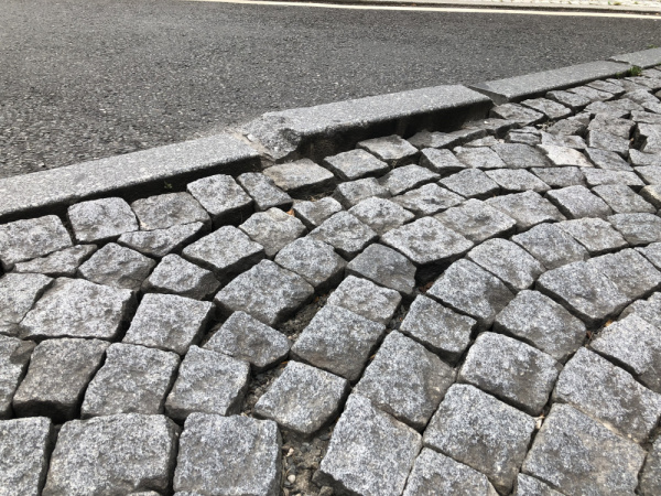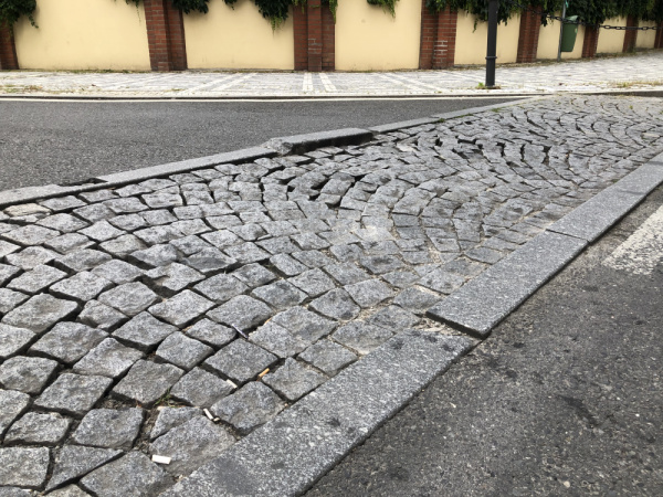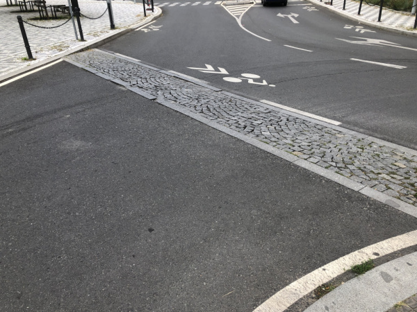 Nedávno opravená vozovka dostala zabrat po přesunutí autobusu z Koněvovy - hrana kamenného nájezdu do Jeseniovy se rozpadá