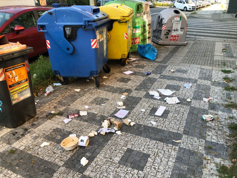 děkujeme za Váš podnět. Poklidí a vyveze firma AVE v pravidelném termínu. Jedno jejich auto vyváží, druhé přijede udělat úklid okolo nádob.