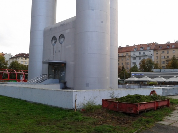 Trvale umístěný kontejner s odpadem: musí to být? Parafrázuji: Vepředu huj, vzadu fuj. Velmi turisticky frekventovaná Žižkovská věž. Děkuji za prověření.