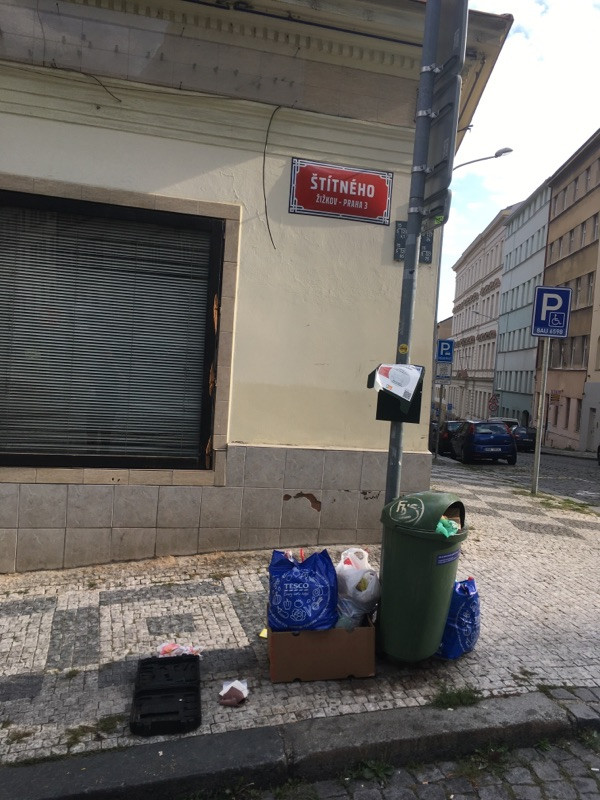 Odpadky u koše na rohu ulic Štítného a Cimburkova