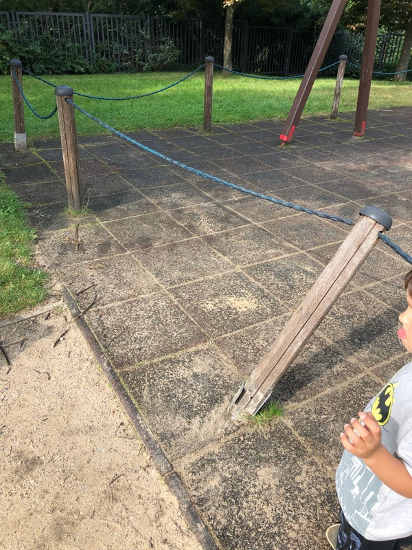 Poškozeny sloupek u houpaček na dětském hřišti Na Balkáně.