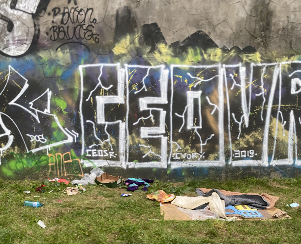 odpadky a oblečení rozházené po celé stezce.
