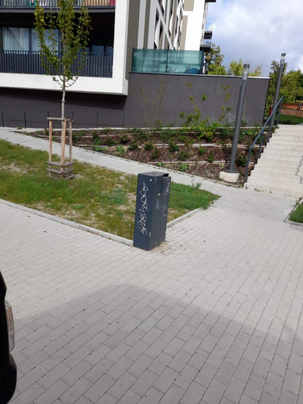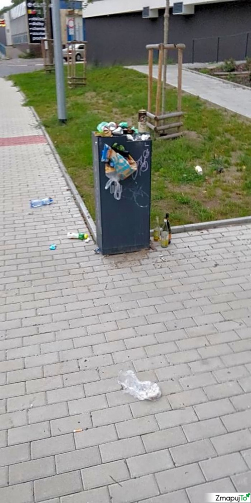 prosím o zajištění úklidu - přeplněný koš a nepořádek v okolí, viz fotografie.