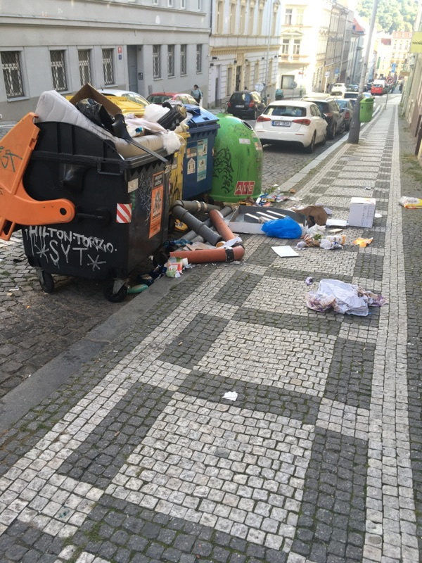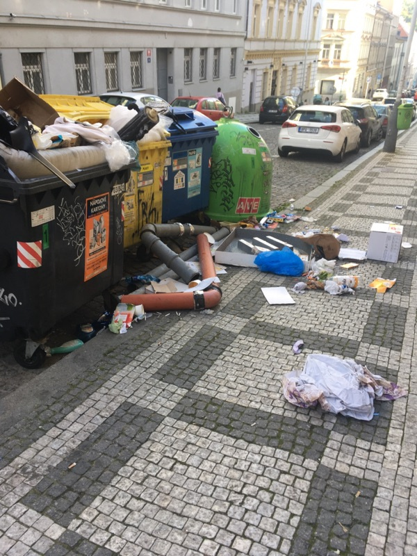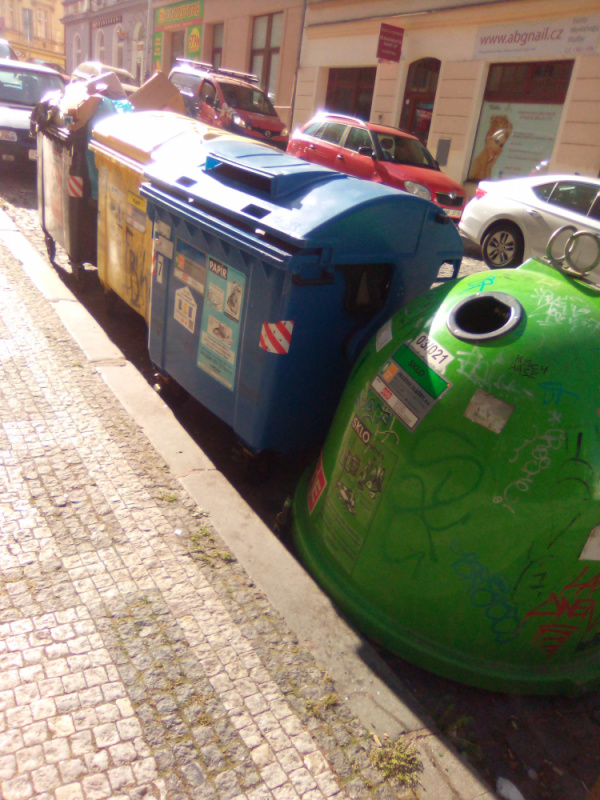 Nepořádek kolem popelnic na tříděný odpad. Dekuji