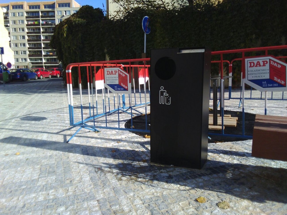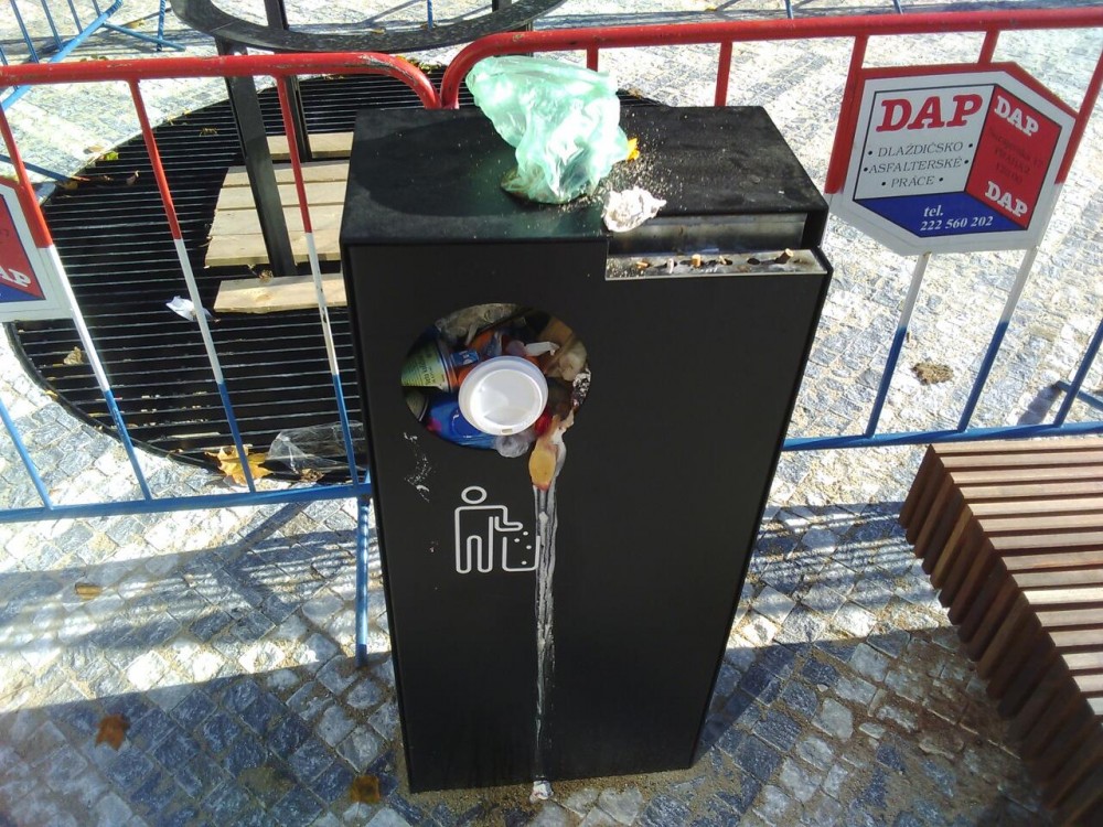 Přeplněný a upatlaný nově osazený odpadkový koš. Zdá se, že jej zapomínájí vysypávat... Děkuji