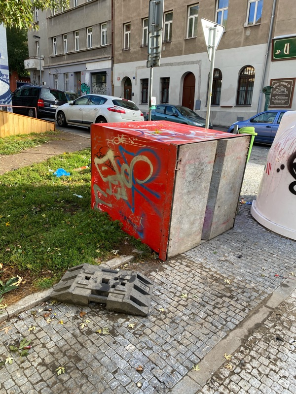 Zadost o odstaneni cerveneho kontejneru na eletroniku. Vim, ze patri soukrome firme, ale je ostuda. 10xdenne je vykradan a obcas to skonci jako na fotografii. Dekuji