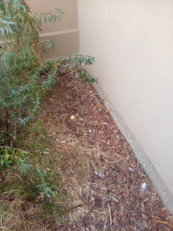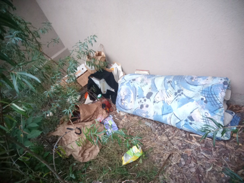 nepořádek po bezdomovci. luční 2619/17. za oplocenými hřištěm na basketbal. je to výklenek ze zadní části domu. děkuji pěkně Iveta