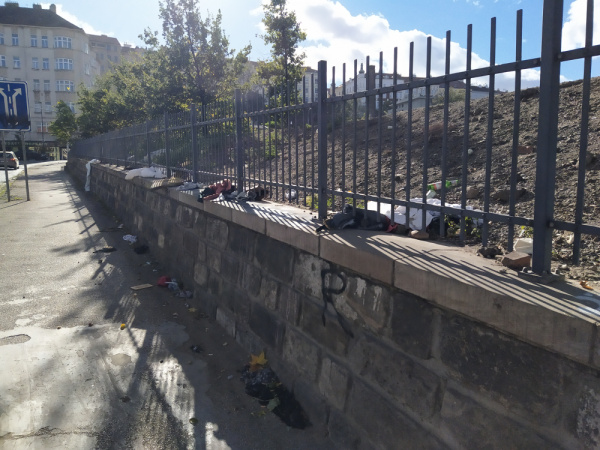 Vítr posunul haldy odpadků k plotu. Reklama na bydlení na dolním Žižkově.