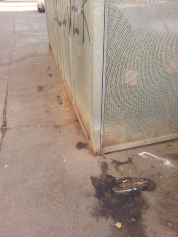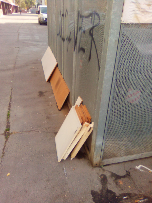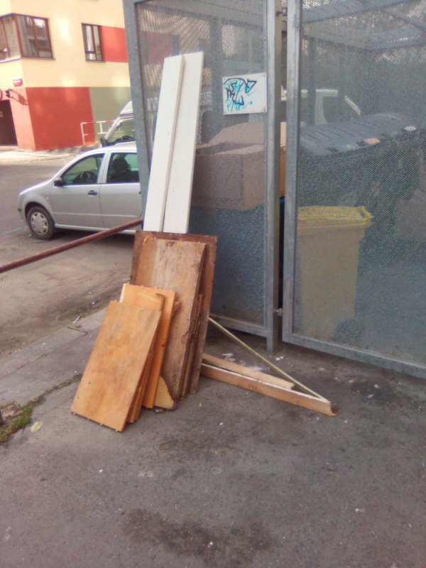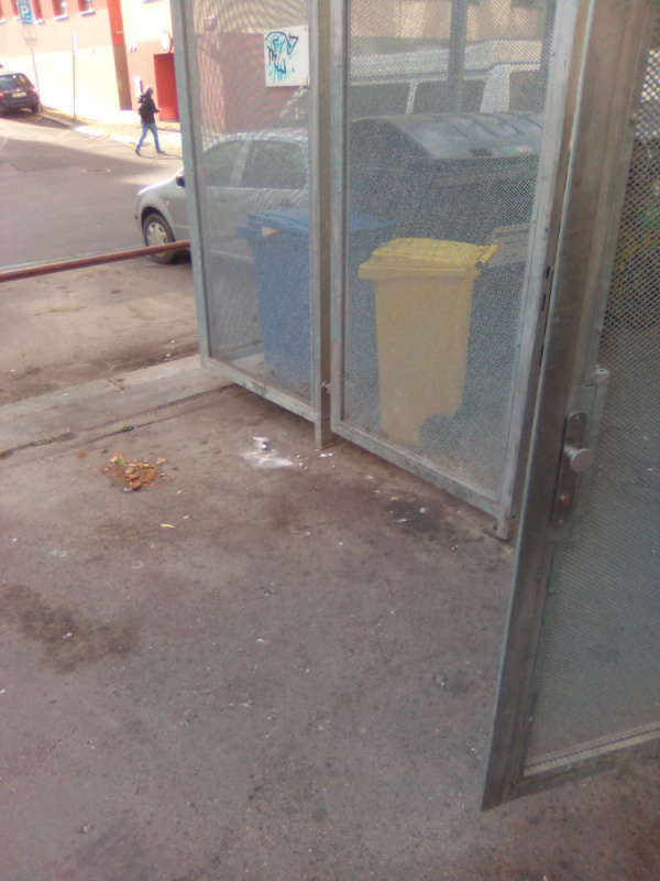 Nepořádek kolem popelnic a v kleci na popelnice.