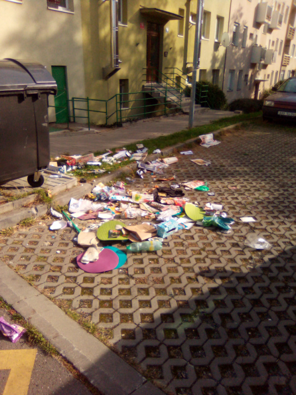 někdo přes noc vytahal pytle z popelnic a roztrhal vše kolem e