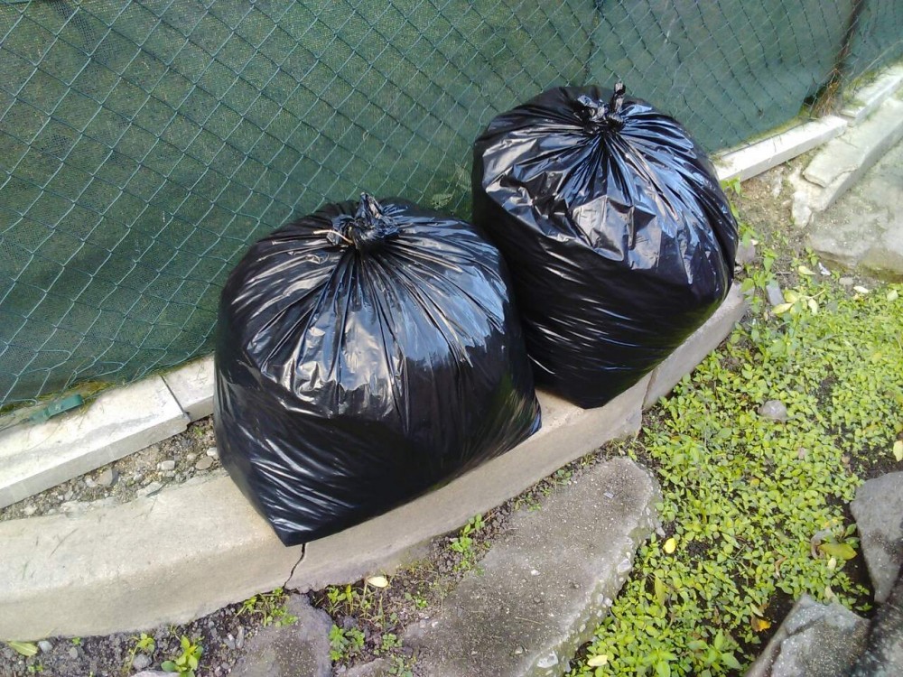 Černé pytle u oplocení.