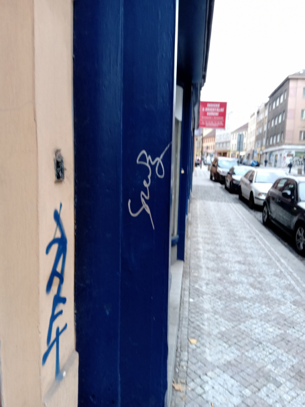 Graffiti na boku výlohy domu Husitská 76/27. Dům je v programu Antigraffiti. Děkuji!