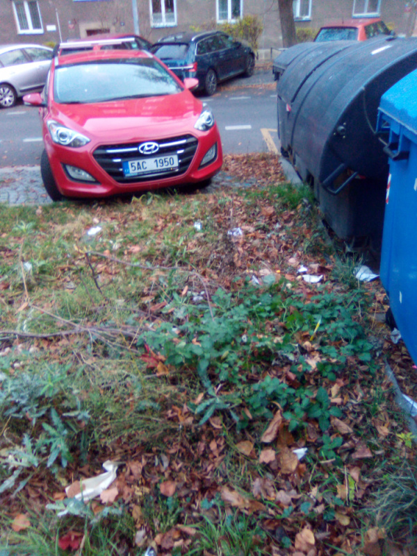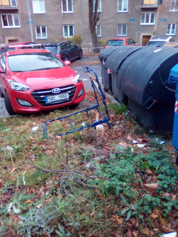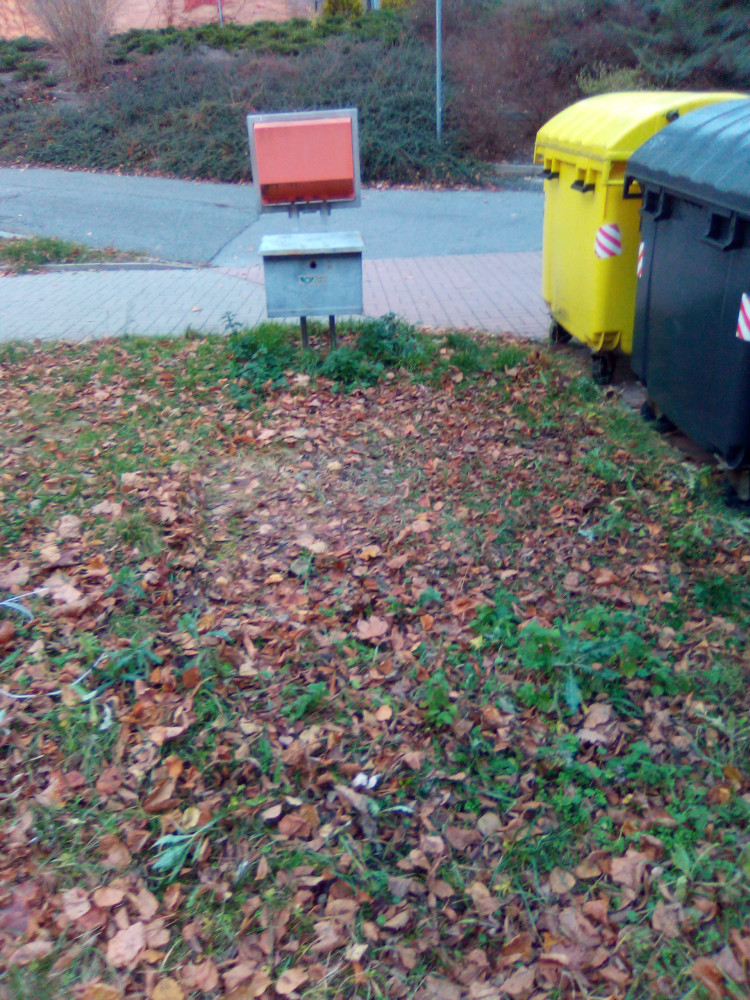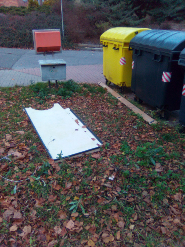 Na trávníku vlevo od popelnic matrace, rovněž z druhé strany popelnic kusy nábytku.