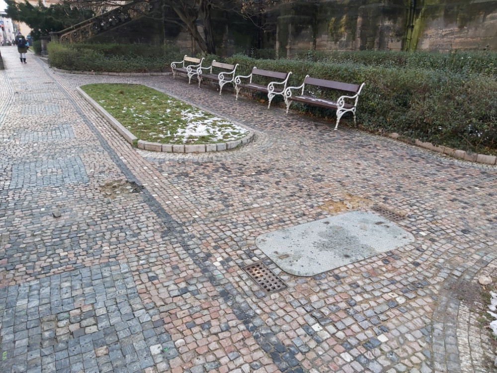 v celé délce chodníku Seifertovy podél kostela cca 5 menších až středních poškození mozaiky a 1 vyvrácený litinový sloupek