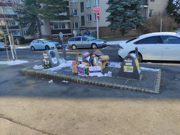 přeplněný kontejner na papír