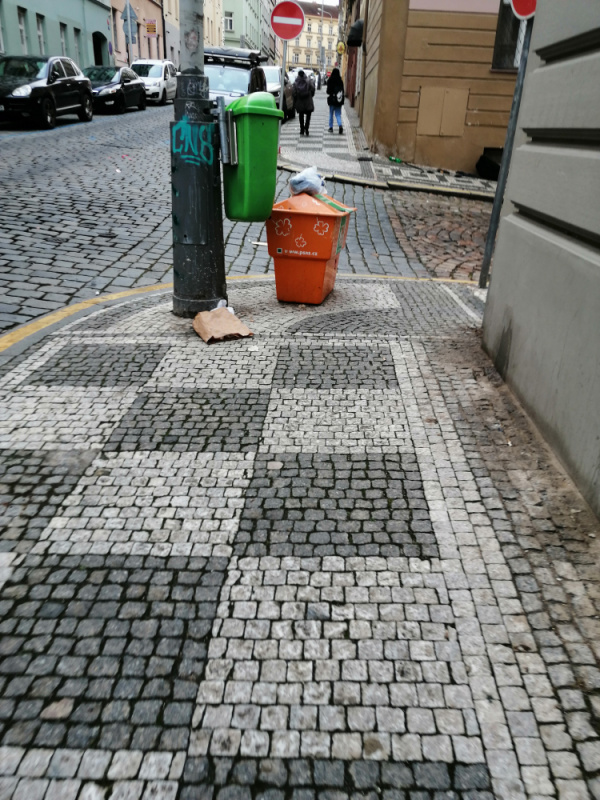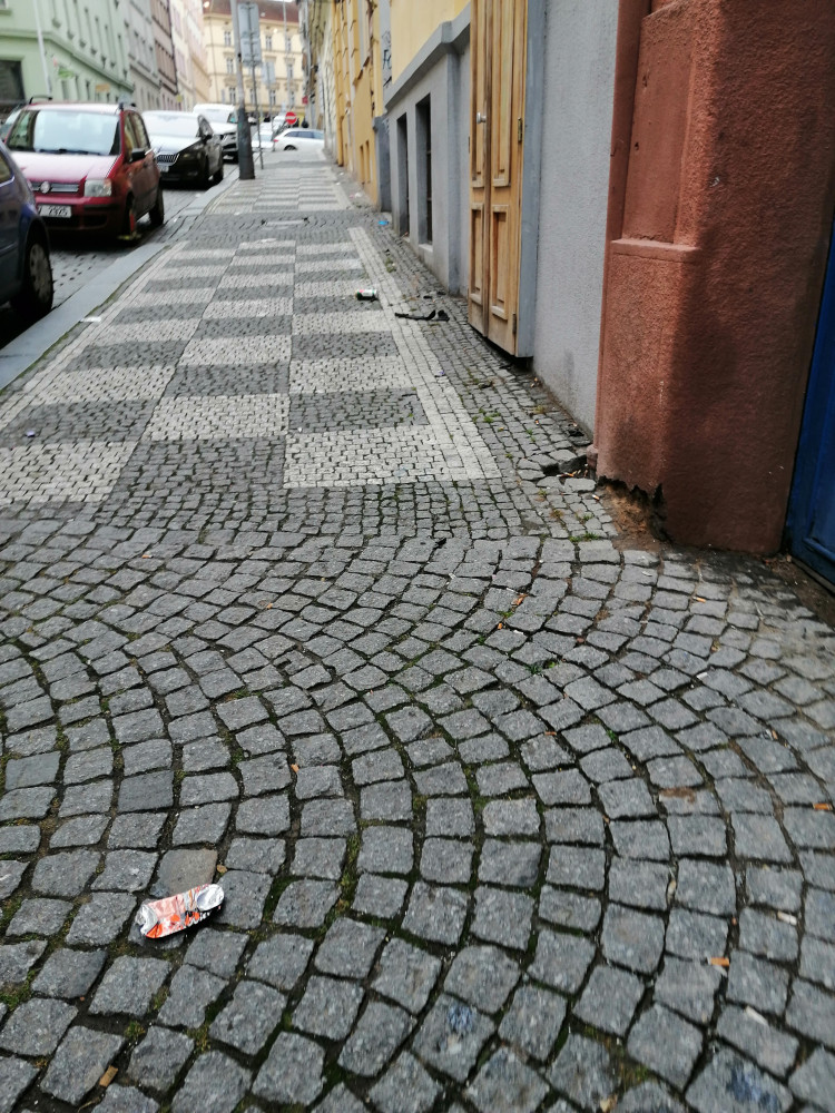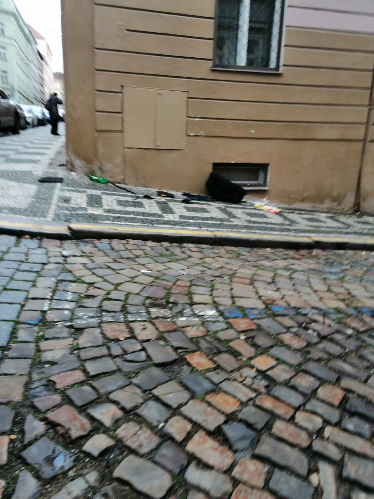 Neporadek (rohazene odpadky, rozbita lahev) na Cimburkove ulici a krizovatce Cimburkove a Dalimilove.