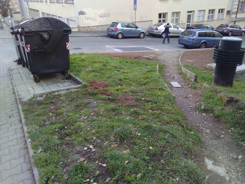 Neporadek kolem nadob na odpad. Naproti Jeseniova 26 Nesouvisi se stavbou
