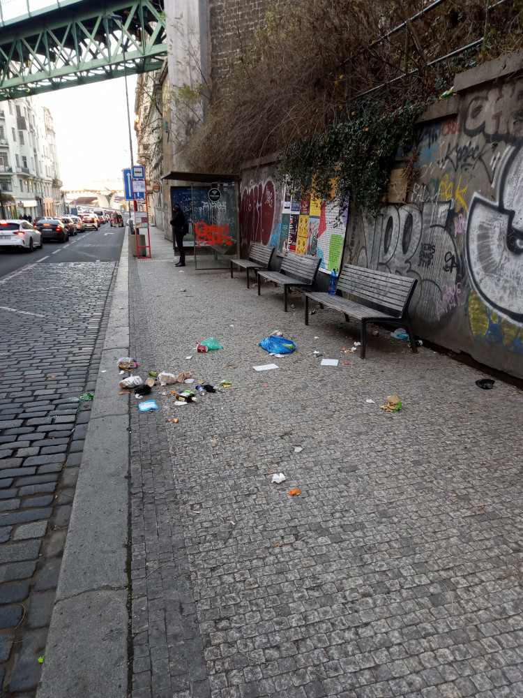 Na chodníku nepořádek - vysypaný odpadkový koš kolem autobusové zastávky. Děkujeme