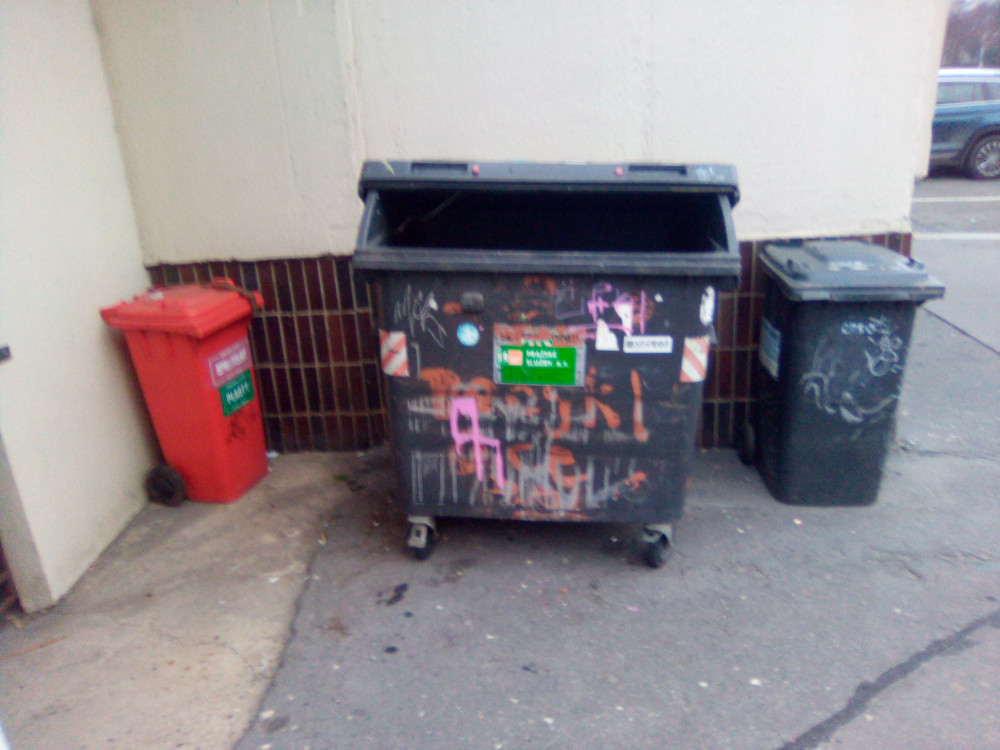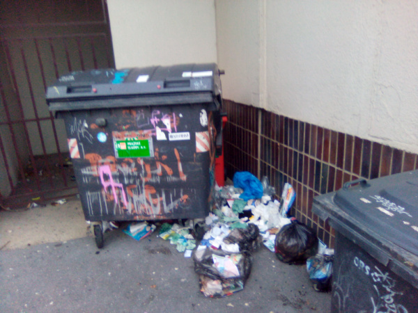 na rohu Prokopovy a Chelčického ulice (budova RIAPSu) někdo vyházel odpadky z obecní velkoobjemové popelnice do jejího okolí.