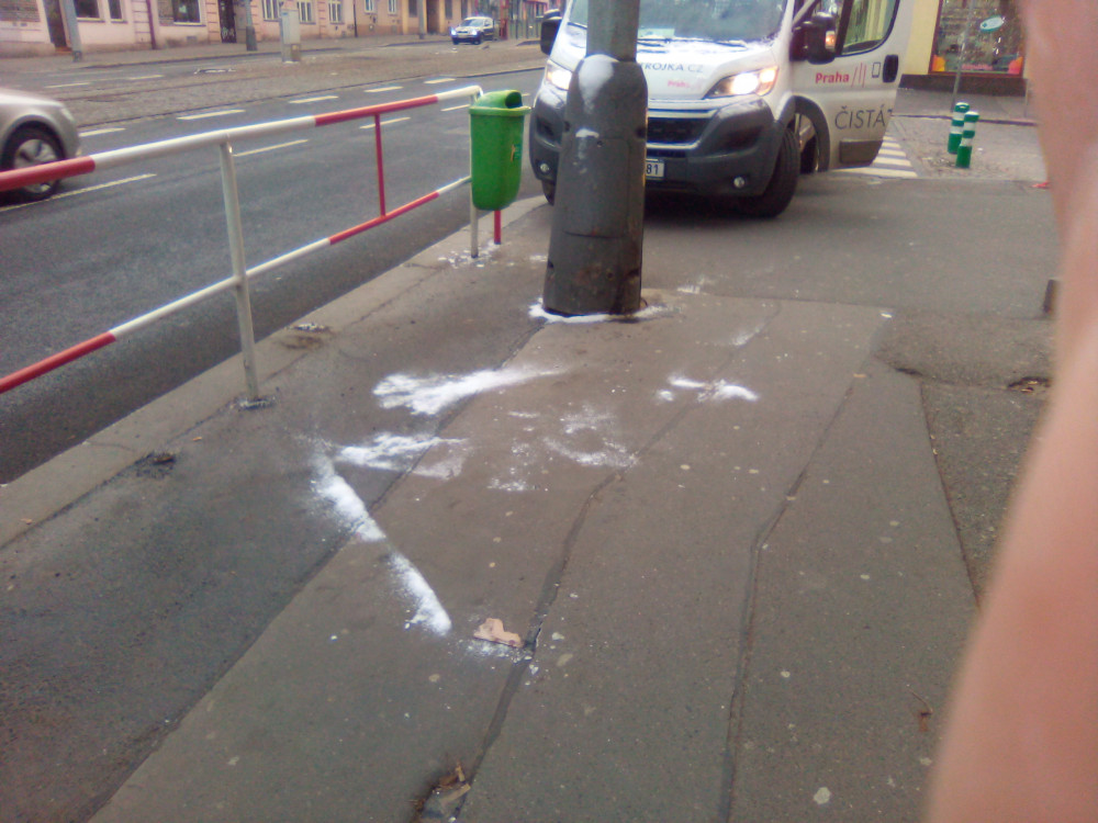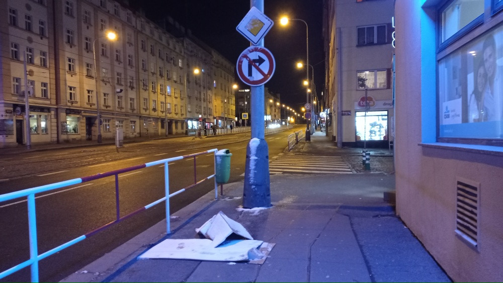 V ulici Želivského se na chodníku před pobočkou ČSOB nachází poházené kusy kartonu.