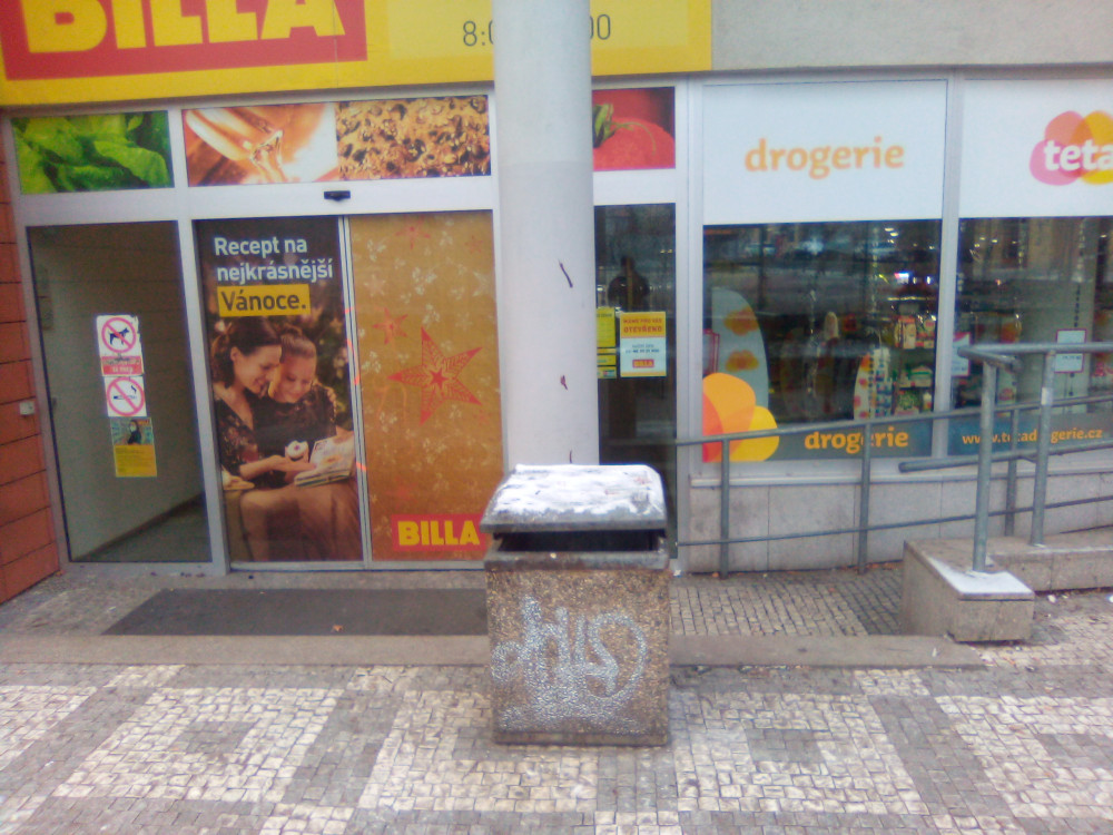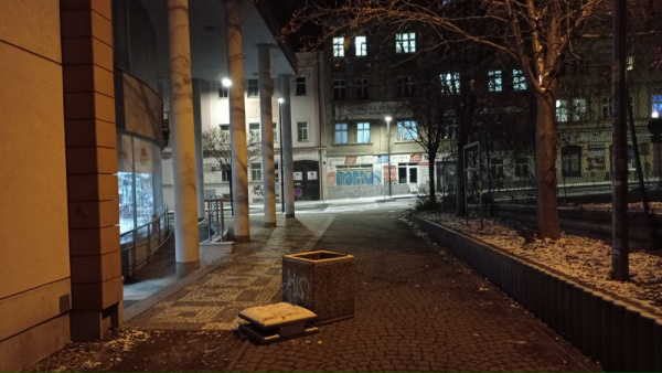 Uprostřed chodníku spojující Koněvovu a Roháčovu ulici se nachází betonový odpadkový koš, jehož víko je pohozené vedle něj.